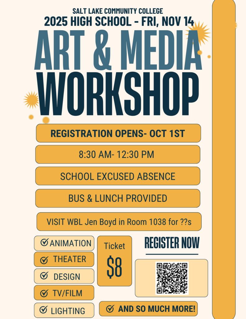 Do you have a student interested in animation, theater, design, tv/film, or lighting etc. etc.? Salt Lake Community College is presenting and art and media workshop Friday, November 14th. Registration opens October 1st, so here’s some important information for you to check out.