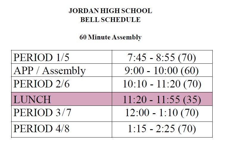 This Thursday, April 30th, is our annual Multicultural Assembly–celebrating the many cultures here at Jordan High. The following is that day’s bell schedule:
