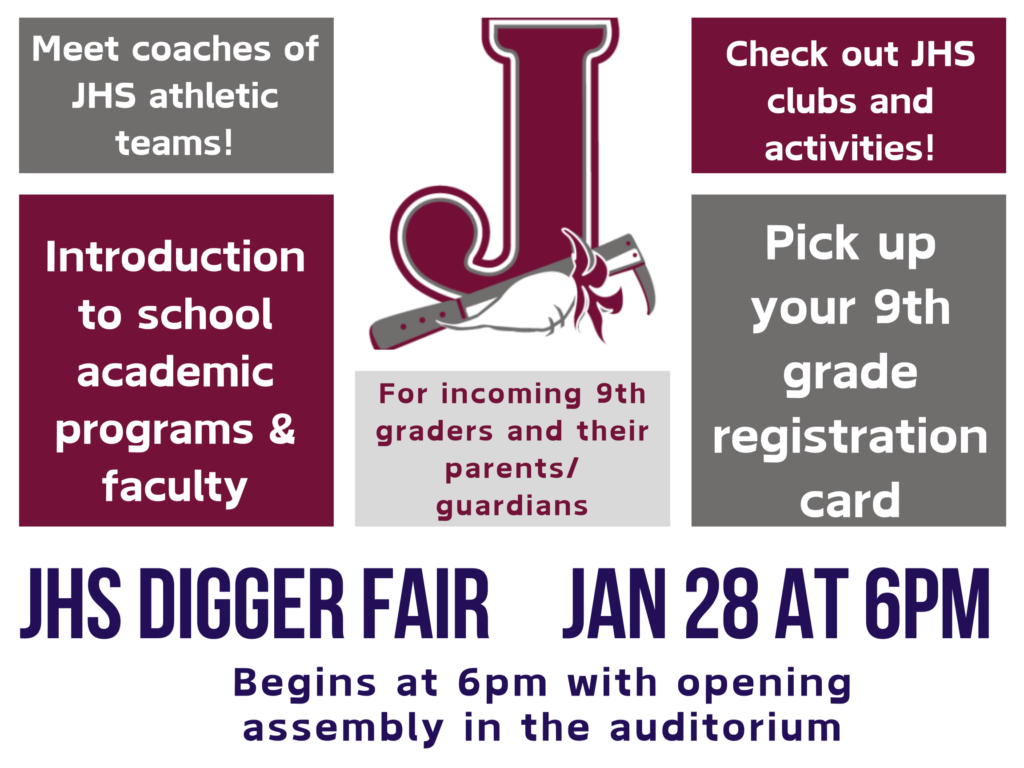 Will you be an incoming Freshmen or new to JHS for the 26-27 Academic year? Then come to the Annual Digger Fair January 28th in the JHS Auditorium at 6 pm to learn about what it means to be a Beetdigger–classes we offer, teams, organizations, and clubs you can join. For more information see below: